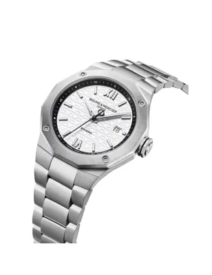 Baume & Mercier Riviera 10829 automatico SW200 con 38 ore di riserva di carica. Cassa acciaio dodecagonale 42mm, quadrante bianco con decoro a onde e rehaut nero, bracciale acciaio intercambiabile, WR 10 bar. Design bicolore anni '50.