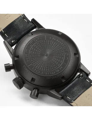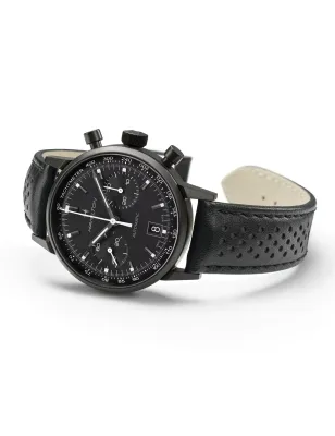 Design e materiali: Cassa da 40mm in acciaio con rivestimento PVD nero total black per un tocco contemporaneo a un modello storico degli anni '70. Quadrante nero opaco con texture granulosa sottile, mentre i totalizzatori presentano finitura azurage per maggiore leggibilità. Cinturino pelle perforato stile racing nero con fibbia PVD nera.
