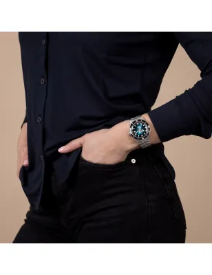 Il vetro zaffiro sagomato, trattato antiriflesso su entrambi i lati, assicura una visibilità perfetta, mentre il fondello e la corona a vite ne aumentano la robustezza. Il bracciale “chicco di riso” in acciaio lucido e satinato, con chiusura tripla piega, garantisce comfort e stile in ogni occasione.