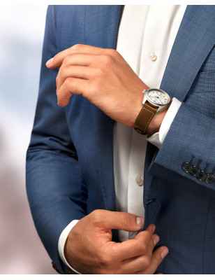 Cinturino: Pelle marrone aviatore con cuciture bianche e fibbia ad ardiglione per comfort robusto ispirato alle tradizioni piloti storici leggendari.
