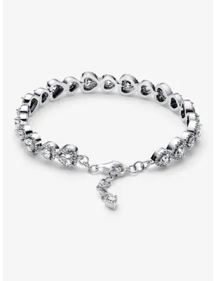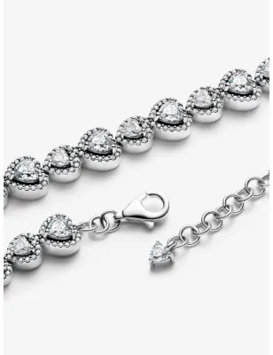 Regala un gioiello unico come il vostro amore. Luminose pietre a forma di cuore circondate da un profilo di pietre di zirconia cubica incolore donano un tocco di romanticismo al classico bracciale tennis.