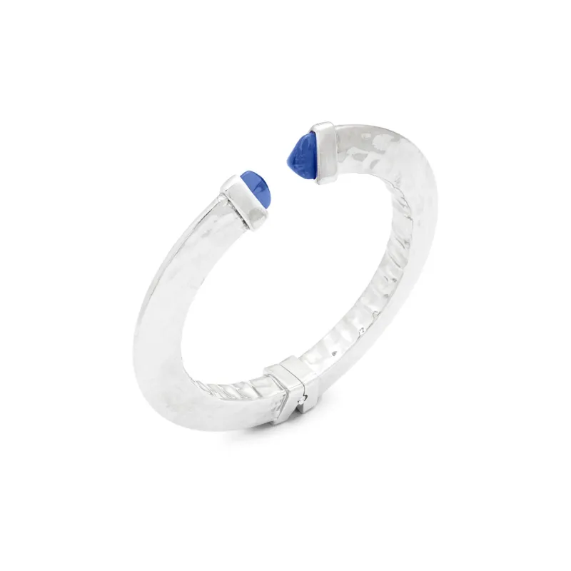 Un bangle ispirato al glamour degli anni Ottanta che si distingue per un sapiente equilibrio di volumi, riflessi e l'intenso tocco cromatico dei cristalli blu, posti alle estremità. Lavorato artigianalmente in azienda, la lastra d'argento viene martellata e successivamente piegata a mano per dar vita a una forma unica. Ideale per essere abbinato ad altri bangle di diverse dimensioni, rappresenta un accessorio versatile e dallo stile inconfondibile.