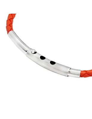 Il bracciale da uomo Wanderlust è in pelle intrecciata color arancione, decorata da piccoli elementi in acciaio. Un gioiello estremamente contemporaneo che bilancia in maniera perfetta modernità e artigianalità. La chiusura scorrevole diventa anch'essa un elemento decorativo e permette la regolazione della misura.