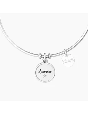 Bracciale rigido in acciaio con ciondolo tondo satinato, bordo lucido, smalto, cristallo bianco e scritta “Laurea”.