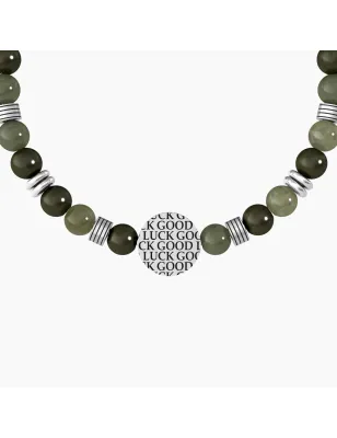 Bracciale elastico da uomo con sfere in diaspro verde alternate a cilindri rigati e anelli in acciaio con piastra tonda di colore nero con quadrifoglio e con scritta "Good luck" sul retro.