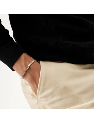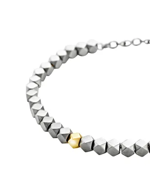 L’iconica collezione Tetra si declina anche in chiave maschile. Il bracciale in acciaio dal finish satinato presenta un design tridimensionale romboidale, valorizzato da un elemento centrale a contrasto in acciaio gold con finitura lucida.