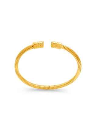 Un iconico bracciale in argento dorato con maglia tubogas a sezione triangolare. Questa versione presenta una forma classica, con apertura centrale, che delinea il polso con eleganza. Le estremità sono rifinite con cappucci in texture croco, anch'essi a sezione triangolare, e abbracciano armoniosamente la maglia del gioiello.