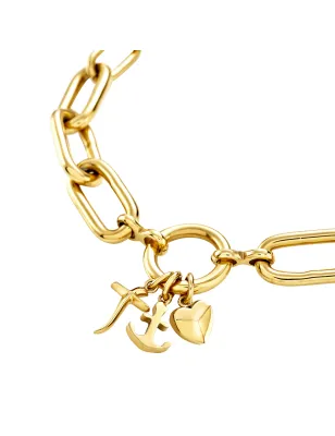 La collana Love Ties è caratterizzata da una catena in acciaio lucido gold con maglie ovali, al cui centro spicca un elemento tondo che ospita tre charms simbolici in acciaio gold: il cuore, che rappresenta l’amore, l’ancora, simbolo di fortuna, e la croce, legata all’idea di protezione.