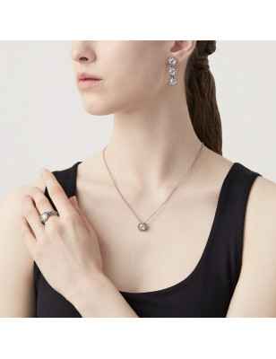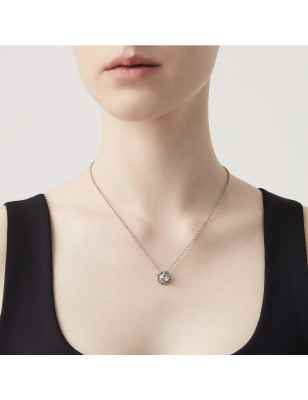 Un elegante pendente, con catena in argento di 45 centimetri, che nasce dal dialogo contemporaneo fra la luminosità purissima dello zircone trasparente e la bellezza del decoro stile Perlage in argento brunito.