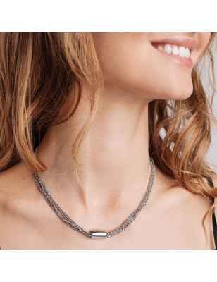 Magnetica System è la collezione di gioielli che, grazie ai suoi diversi elementi e alle chiusure magnetiche, può essere modificata e assumere forme e stili sempre diversi. Il girocollo Eclipse è in acciaio lucido, composto da micro catene che luccicano delicatamente sulla pelle. Può essere indossato da solo o abbinato ad ogni altro elemento della collezione, per creare nuove collane di diverse lunghezze.