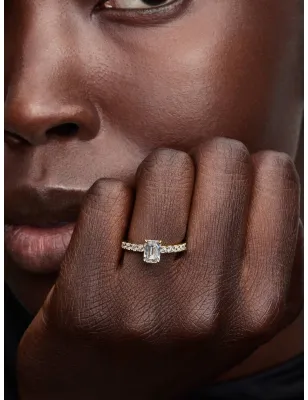 Un gioiello dal taglio perfetto. Rifinito in Oro, questo anello presenta una pietra incolore in rilievo con una fascia decorata per metà da pavé. Il gioiello perfetto per completare qualsiasi outfit.