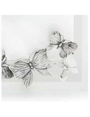 Il decoro di farfalle in argento, prezioso e delicato, rende unica questa cornice caratterizzata dalla grande luminosità dei bordi in vetro trasparente. Le farfalle, poste con eleganza sul lato inferiore, sono realizzate a mano con l'antica tecnica della fusione a cera persa e successiva brunitura.