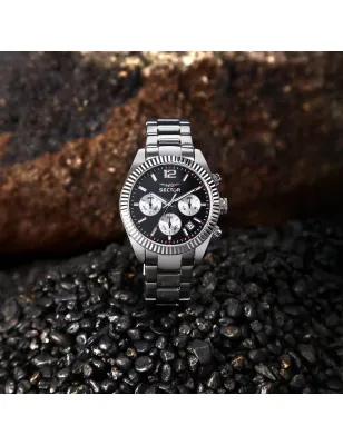 Sector 240 R3273640029 cronografo uomo collezione 2025 cassa acciaio 316L da 39mm quadrante nero con contatori argento. Bracciale acciaio con chiusura deployante, movimento quarzo, impermeabilità 5 ATM. Design sportivo moderno No Limits.