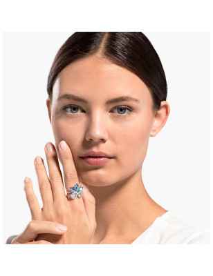 Anello Swarovski che rievoca immagini di fiori e della bellezza della natura. Cinque pietre in diverse tonalità di blu, verde e bianco sono disposte come petali di fiori su un anello rodiato, riflettendo e rifrangendo la luce.
