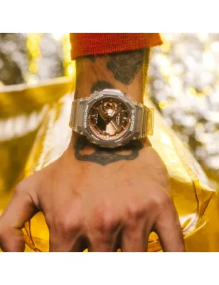 Casio G-Shock GA-2100BM-7A5 CasiOak trasparente con quadrante oro rosa metallizzato. Cassa Carbon Core Guard 45,4mm resistenza urti 20 bar, cronometro centesimi secondo, timer countdown, 5 allarmi, doppia illuminazione LED bianca, calendario automatico 2099, cinturino resina trasparente regolabile, peso 51g.