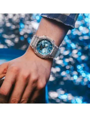 Casio G-Shock GA-2100BM-7A2 CasiOak trasparente con quadrante blu cielo metallizzato deposizione vapore. Cassa Carbon Core Guard crystal clear, cronometro centesimi secondo, timer countdown, doppia illuminazione LED bianca, calendario automatico 2099, impermeabile 200m, peso 51g.
