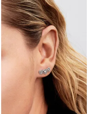 Per il passato, il presente e il futuro. Questi orecchini a lobo in Argento Sterling 925 sono decorati da tre pietre a forma di cuore collegate da un pavé di punti luce. Un simbolo luminoso dell’amore in tutte le sue fasi.