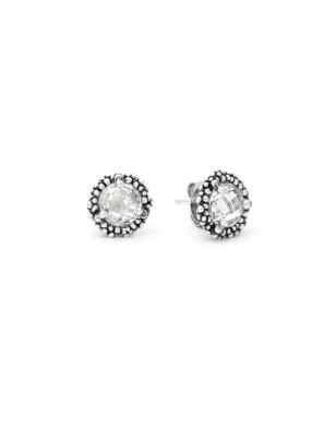 Questi orecchini, dalla delicata e luminosa eleganza, nascono dal connubio fra la purezza degli zirconi trasparenti e la bellezza contemporanea del decoro stile Perlage in argento brunito.