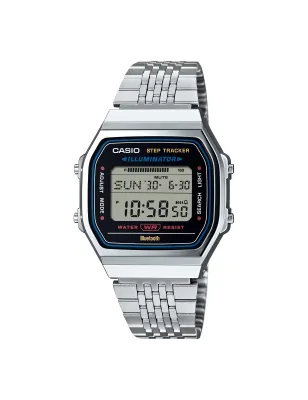 Collezione Vintage Casio digitale step tracker contapassi automatico Bluetooth smartphone app CASIO WATCHES, cronografo memoria 200 registrazioni, timer, 5 alarm, retroilluminazione LED ambra, cassa resina cromata 38mm, bracciale acciaio maglie piatte confortevole, vetro resina.