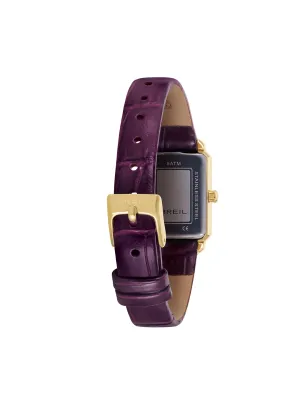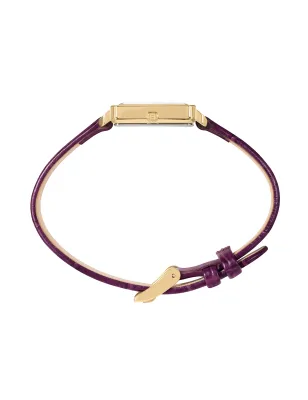 L'orologio solo tempo da donna Carrè è un piccolo gioiellino che veste il polso con eleganza e discrezione. La cassa rettangolare in acciaio color oro incornicia un quadrante bianco lucido, abbinato al cinturino in pregiata pelle stampa cocco color viola, nuance di tendenza e perfetta per le feste natalizie. Il vetro sfaccettato arricchisce ulteriormente il design di questo accessorio must have per la stagione.