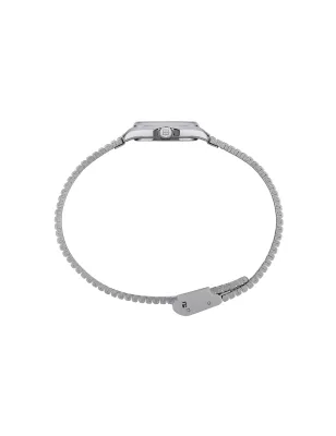 L'orologio da donna Stylize prende ispirazione dai tratti tipici dell'Art Decò, caratterizzata da forme geometriche e linee ripetute. L'orologio solo tempo in acciaio lucido ha la cassa di forma che si adatta anche ai polsi più piccoli, abbinata a un bracciale a fitte maglie zigrinate. Il quadrante minimal e pulito è nero e si concede quattro deliziosi cristalli agli indici.