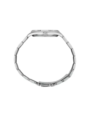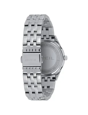 L'orologio solo tempo da donna in acciaio Stand Up è caratterizzato da un design solo apparentemente classico, ricco di dettagli e finezze che lo rendono unico. La lavorazione delle maglie del bracciale richiama la zigrinatura della lunetta, il datario a ore 6 spezza la fila di cristalli applicati agli indici che illuminano il quadrante pulito e privo di eccessi, la sfera dei secondi è arricchita di una leziosa B che diventa un elemento distintivo
