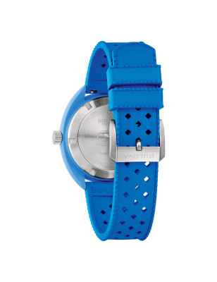 Bulova Snorkel Hammerhead Shark 98B445 movimento quarzo Miyota 2115 precisione ±15 secondi al mese. Cassa ceramica ibrida blu oceano 41mm spessore 14,6mm ultra-leggera, quadrante blu coordinato motivo onde marine, lunetta girevole unidirezionale blu, fondello inciso squalo martello, cinturino gomma blu perforato, WR 100m.