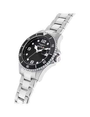 Sector 230 R3253161048 tempo e data uomo cassa acciaio 39mm spessore 11.40mm finitura lucida satinata. Quadrante nero, lunetta nera, bracciale acciaio silver, fibbia diver con pulsanti e blocco sicurezza, movimento quarzo preciso, impermeabile 100m, garanzia ufficiale Sector.
