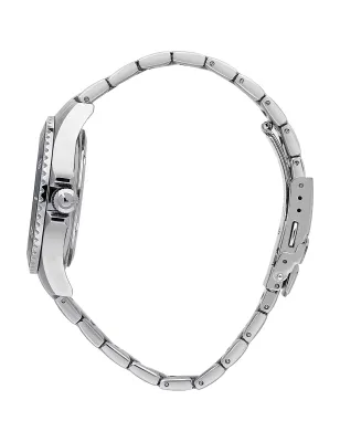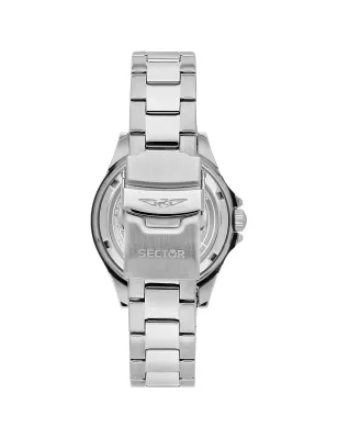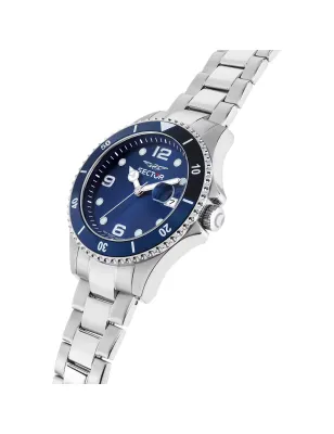 Sector 230 R3253161049 tempo e data uomo cassa acciaio 39mm spessore 11.40mm finitura lucida satinata. Quadrante blu, lunetta bicolore blu e nera, bracciale acciaio silver, fibbia diver con pulsanti e blocco sicurezza, movimento quarzo preciso, impermeabile 100m, garanzia ufficiale Sector.