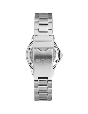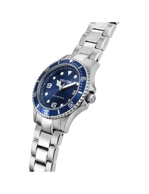 Sector 230 R3253161547 tempo e data donna quarzo cassa acciaio 35mm spessore 9.75mm finitura lucida satinata. Quadrante blu, lunetta blu, bracciale acciaio silver, fibbia diver con blocco sicurezza, movimento quarzo preciso, impermeabile 100m, garanzia ufficiale Sector.