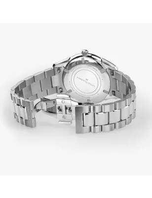 Hamilton Jazzmaster Quartz ref. H32461121 con movimento al quarzo Swiss Made calibro ETA F06.105 che garantisce precisione estrema. I meccanismi al quarzo sono noti per la loro precisione poiché comportano un solo minuto di variazione all'anno. La batteria invia energia elettrica al cristallo di quarzo per misurare il tempo con precisione assoluta per affidabilità quotidiana superiore con manutenzione minima richiesta solo cambio batteria periodico ogni 2-3 anni.