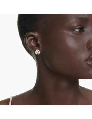 Orecchini Dextera placcati color oro rosa, cerchio centrale. Metà pavé di cristalli e Swarovski Zirconia danzante centrale. Abbinabili al pendente per look gioioso e scintillante.
